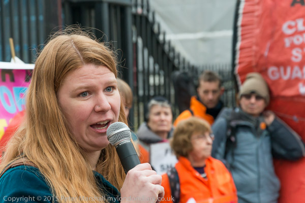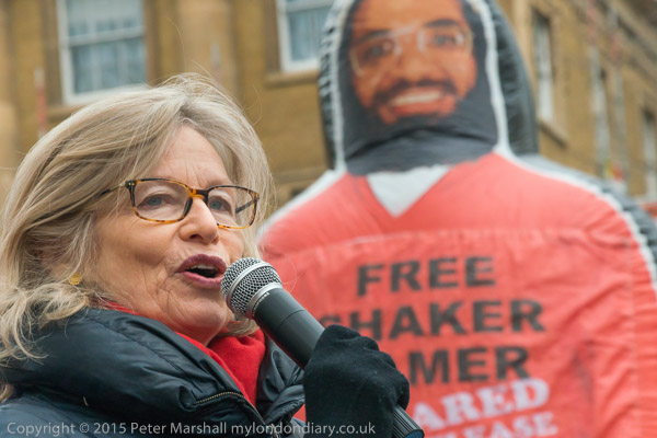 Author/Journalist Victoria Brittain speaking in front of a giant inflatable Shaker Aamer