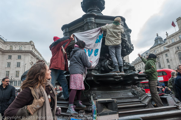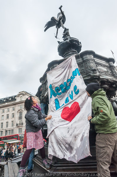 Venus watches as people put up the Reclaim Love banner on the base of Eros