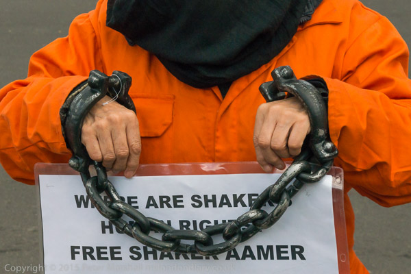 Chains over the message 'Where are Shaker's Huamn Rights? Free Shaker Aamer'