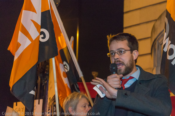 Green Party councillor Scott Ainslie speaking at the protest rally at Lambeth Town Hall before going in to vote against the £90m cuts