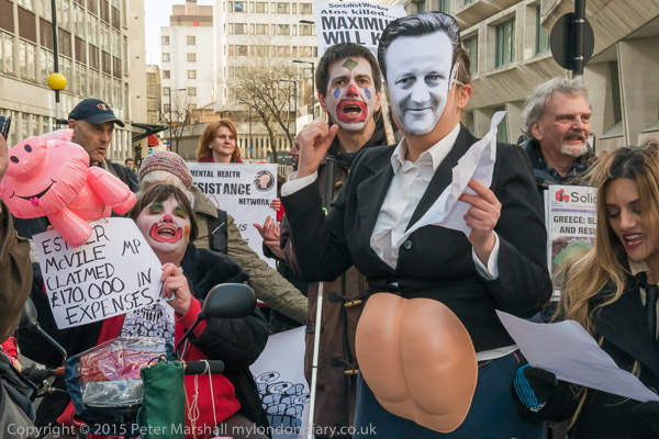 and Kilburn Unemployed Worker’s Group Choir wearing David Cameron masks sing their 'David Cameron is a W******'.