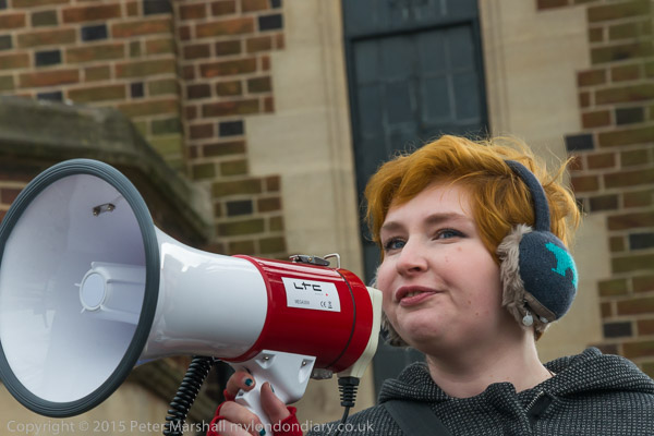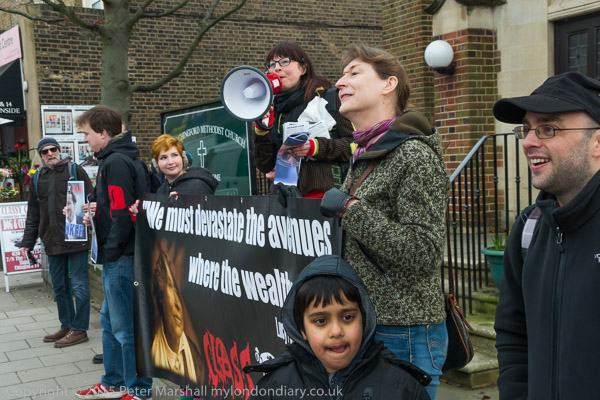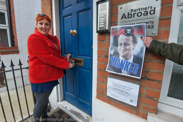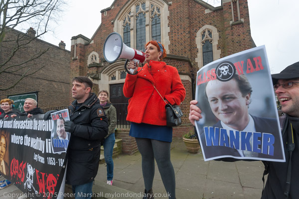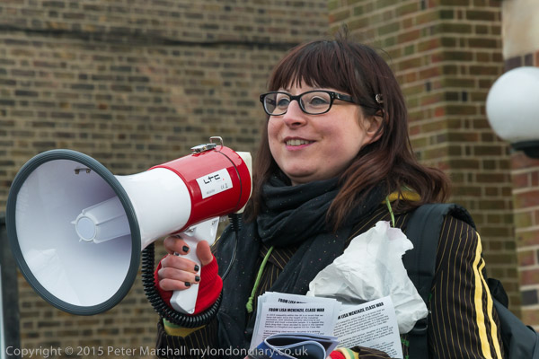 Lisa McKenzie holds a 2010 Class War election poster of David Cameron at the rally