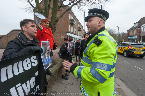 The officer tells Stan he will be arrested unless he puts the poster away and goes back over the road to the parked police van