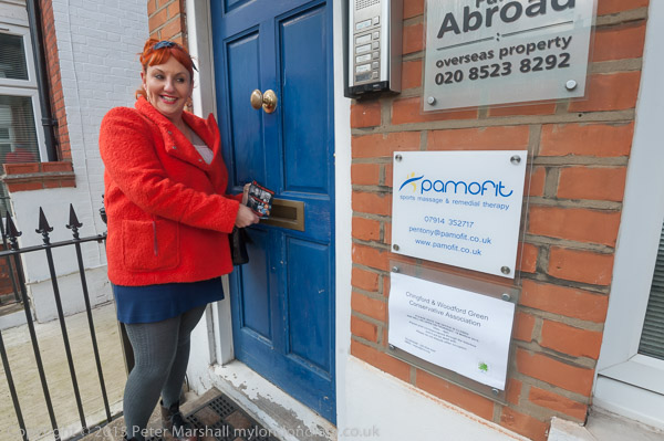 Lisa McKenzie puts a leaflet in the Chingford & Woodford Green Conservative Association letter box