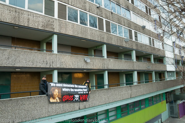 ![]() Inside the occupied flat ![]() ![]() ![]() Stan and others on the balcony ![]() Jon Bigger, Stan and others ![]() ![]() Lisa McKenzie. I got shouted at for taking this picture, but all those whose faces are shown were happy to be photographed ![]() The view to the East, with the City at left and Canary Wharf just to right of centre ![]() Jenny and Stan hold the Class War banner next to the lifts in Chiltern House ![]() And in front of some of the 'decanted' flats the council is about to demolish ![]() |