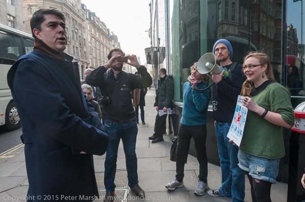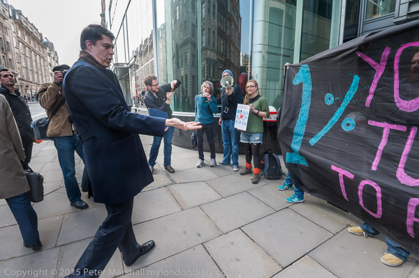 A man - perhaps a banker - stops to criticise the protesters. He claims not to be able to understand the banner about the 1%