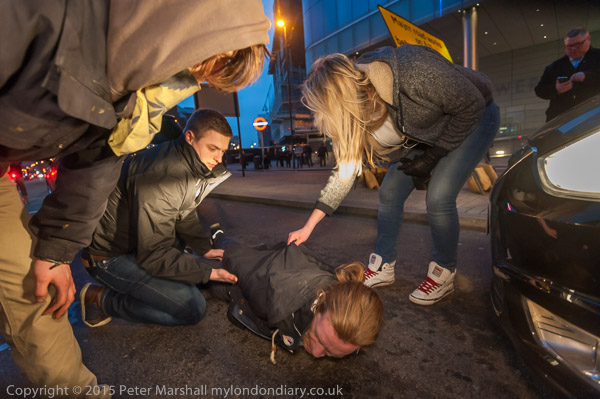 but two plain clothers police block the outside lane, holding a man on the roadway and handcuffing him