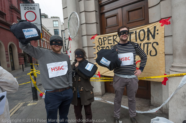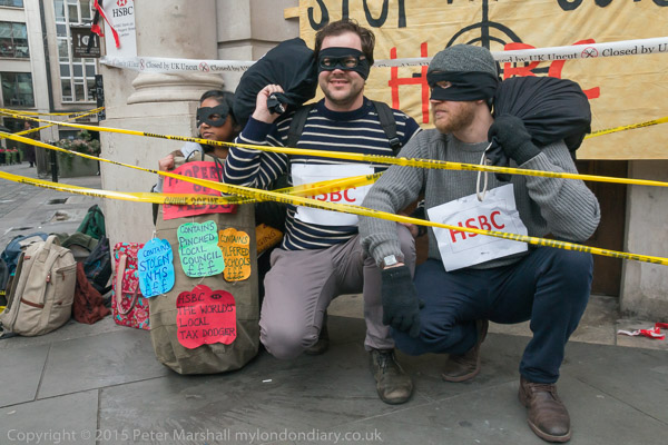 One of the HSBC burglars with a notice 'Tax Dodging is Theft'