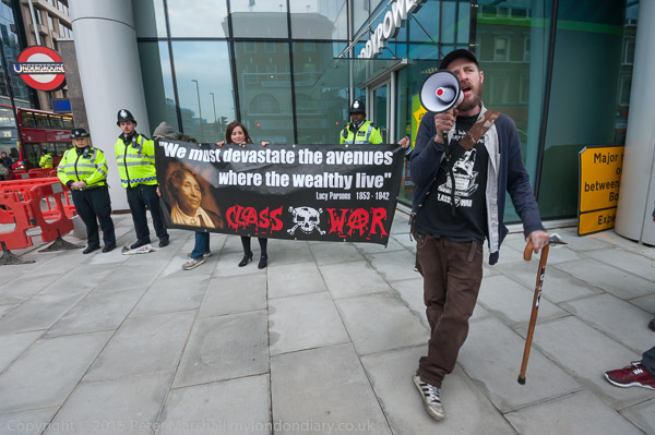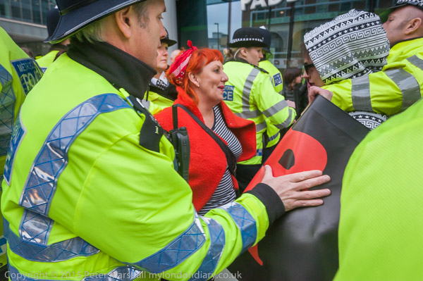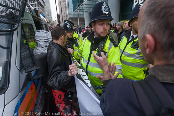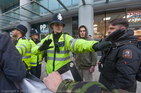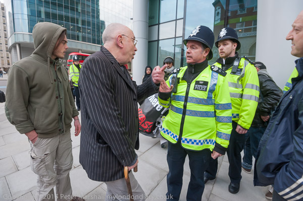 Ian Bone talks angrily to the officer in charge, who replys angrily, refuses to talk any more and walks away