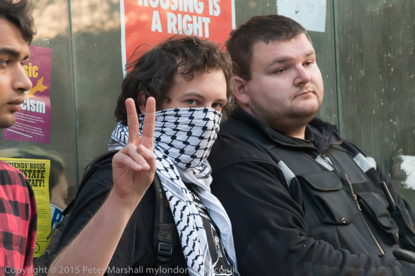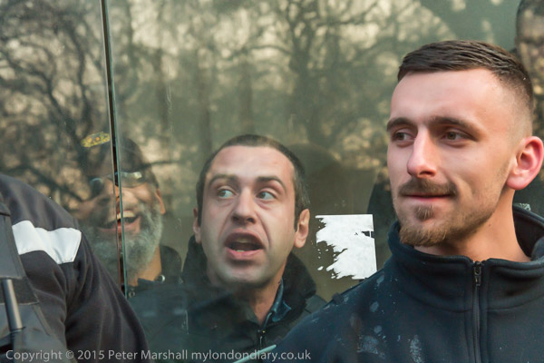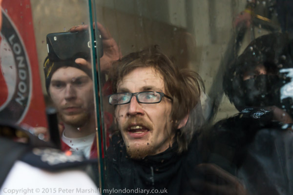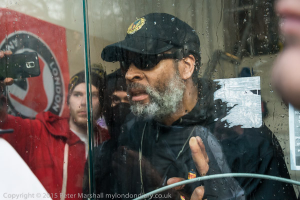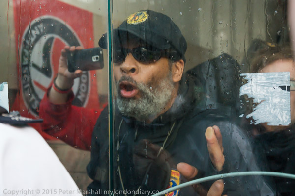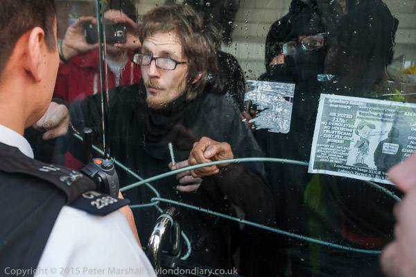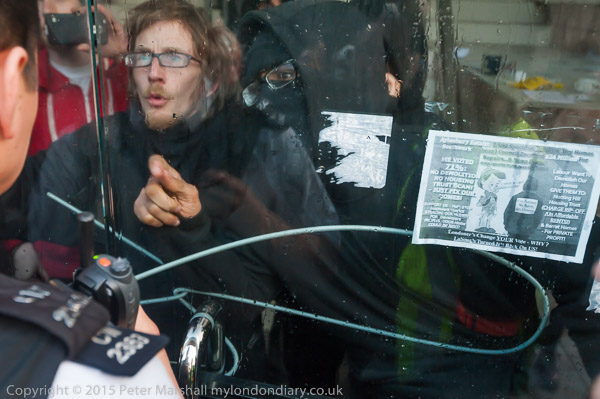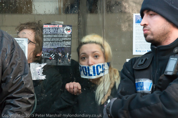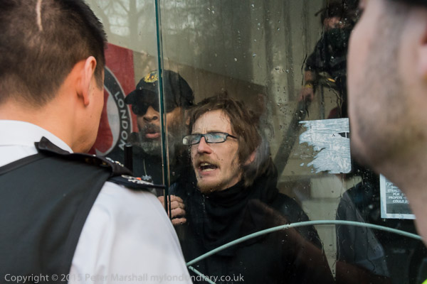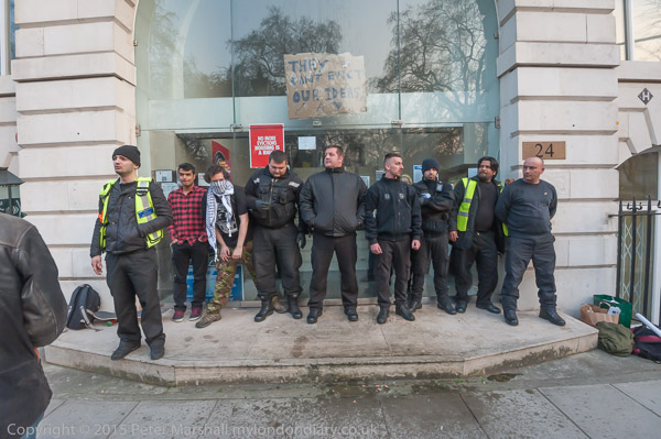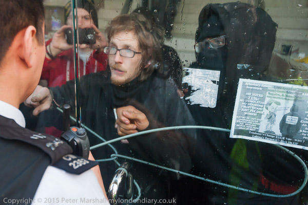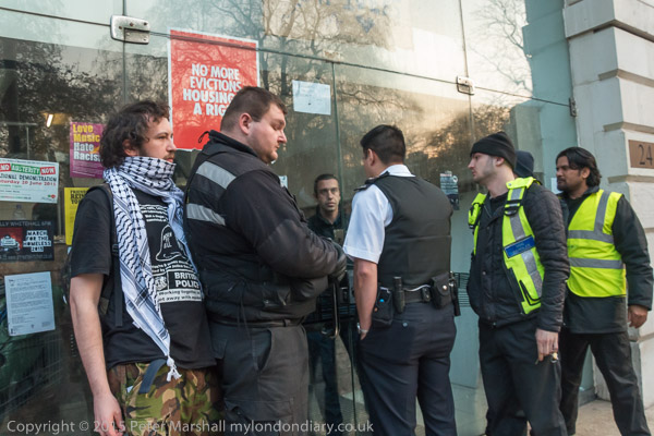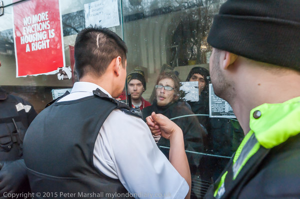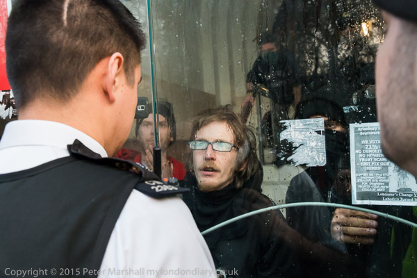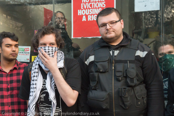 ![]() ![]() We could hear through the doors, and see, but the reflections made photography difficult ![]() One of the secuirty was wearing his licence, but hiding it between his arm and his body - until he got angry and lifted his arm to reveal his licence number ![]() Seven security guards and only one wearing his SIA licence - and that one was trying to hide it ![]() ![]() ![]() Police arrive and an officer comes to talk with the occupiers ![]() ![]() ![]() who complain about the illegal activity by the security guards who come from a company called LAPA security (though they would not admit who they |