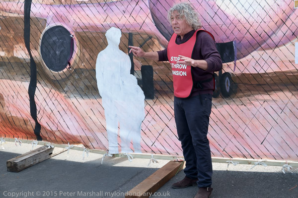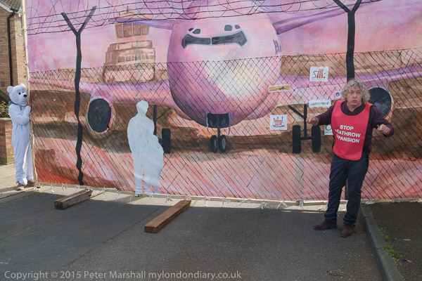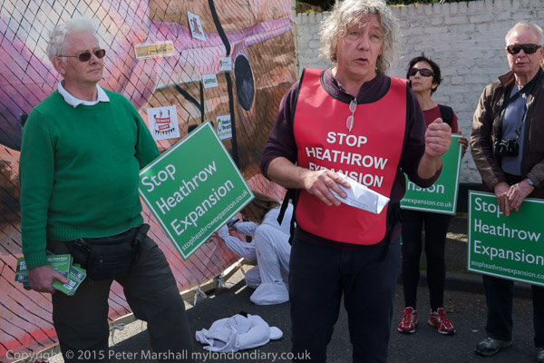 Neil Keveren of Stop Heathrow Expansion in front of the Heathrow mural where the boundary would be