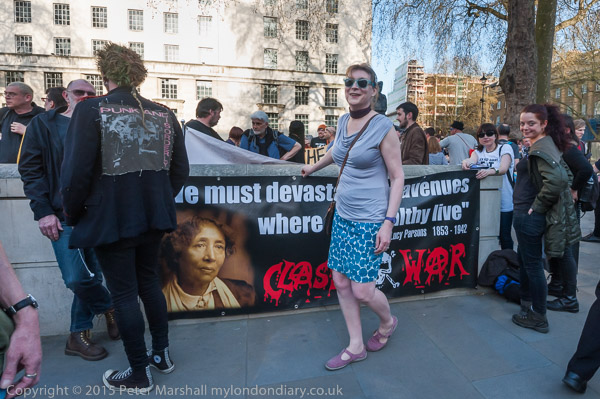 Class War's banner with its Lucy Parsons quote "We must devastate the avenues where the wealthy live'