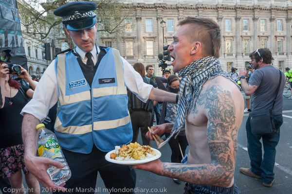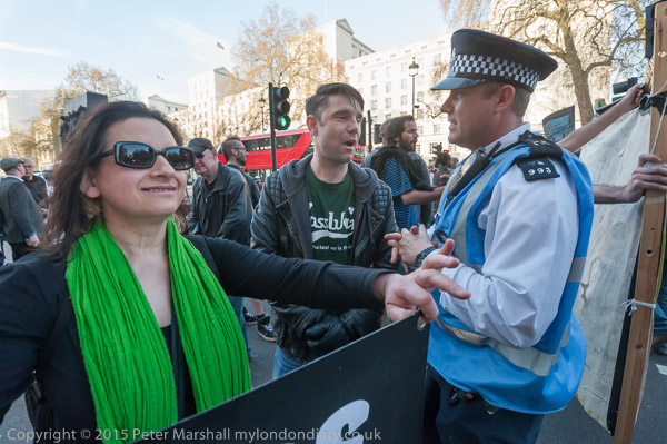 A police liaison officer talks to a protester as people take over the road on both carriageways at Downing St