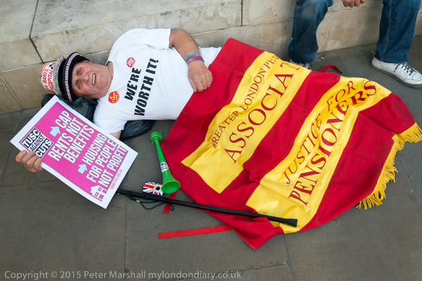 Terry stages a lone lie-in with the Greater London Pensioners Association banner and a TUSC poster