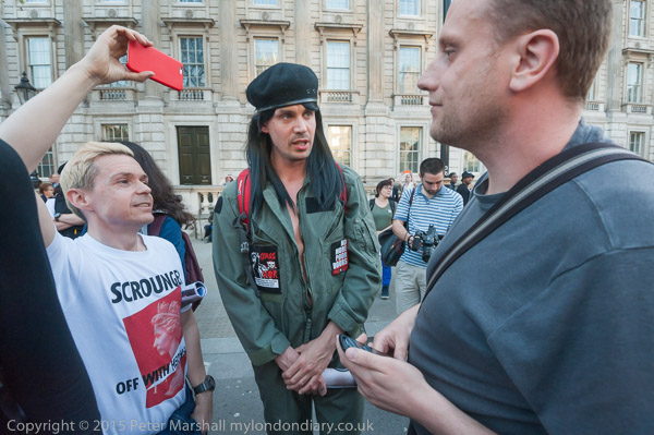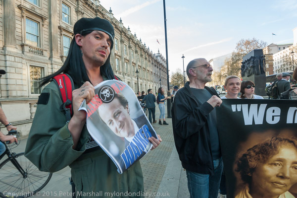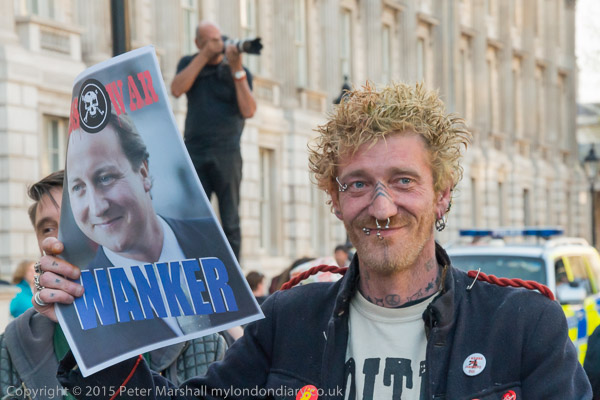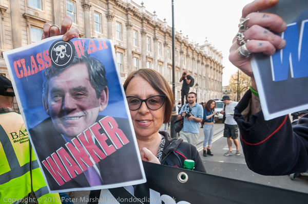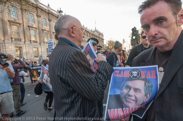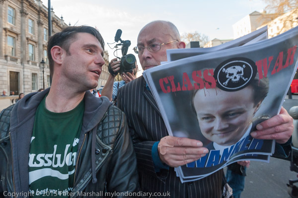Ian Bone holds up a Class War poster of Cameron at the gates of Downing St