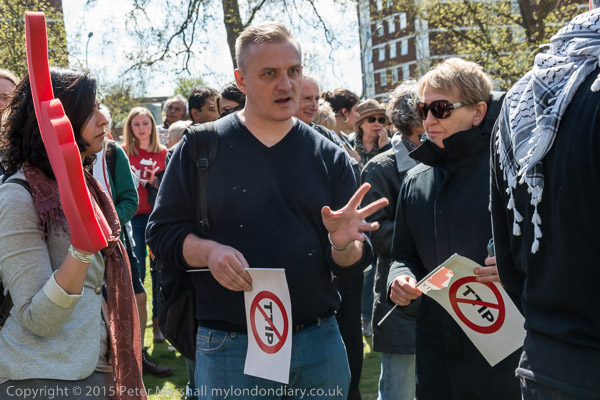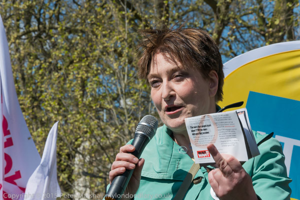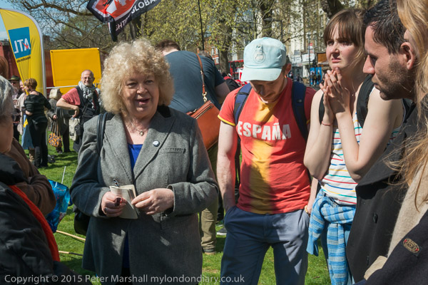 London Green Party MEP Jean Lambert speaks in one of the participatory discussion groups at the Day of Dissent rally