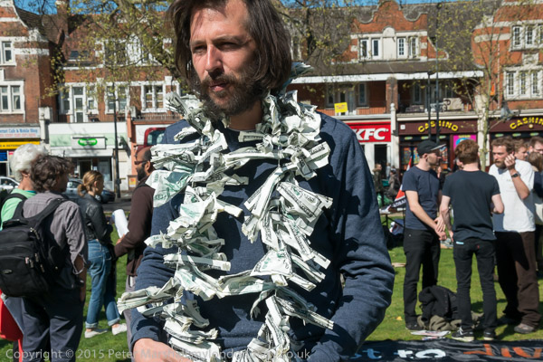 George Barda offers his garland of dollars to 'Richard Branson'.