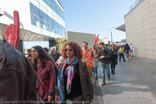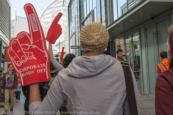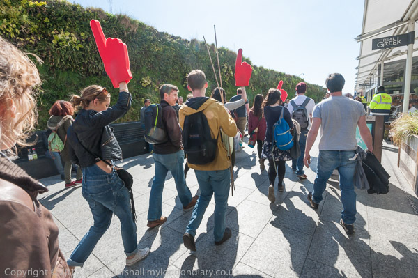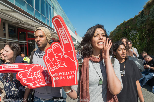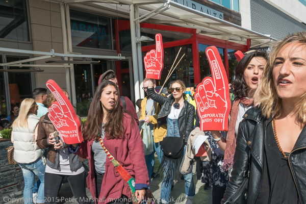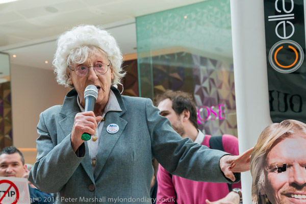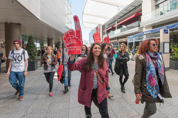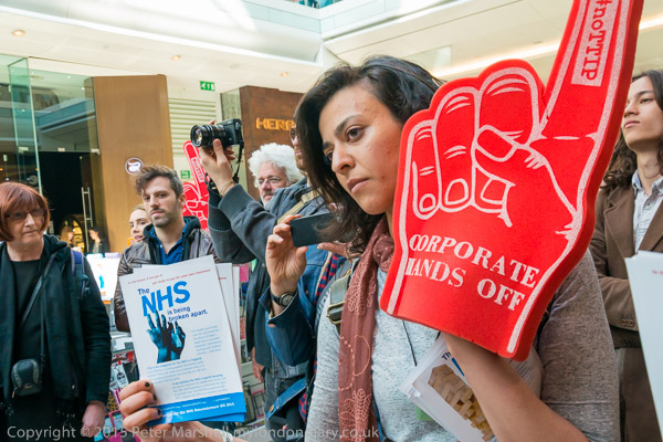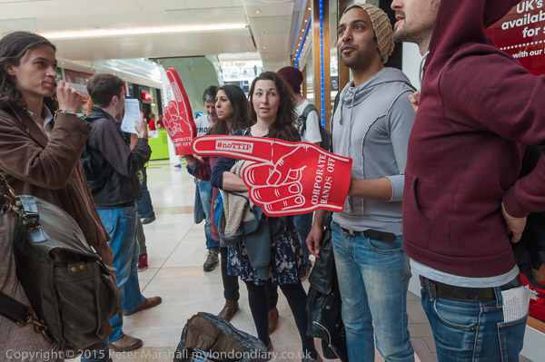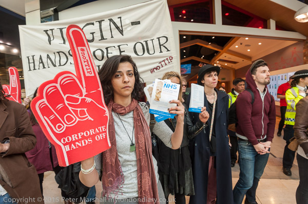 Protesters walk in to the Westfield Centre to protest outside Virgin over the danger that TTIP poses to our NHS.