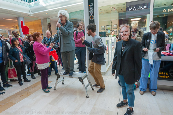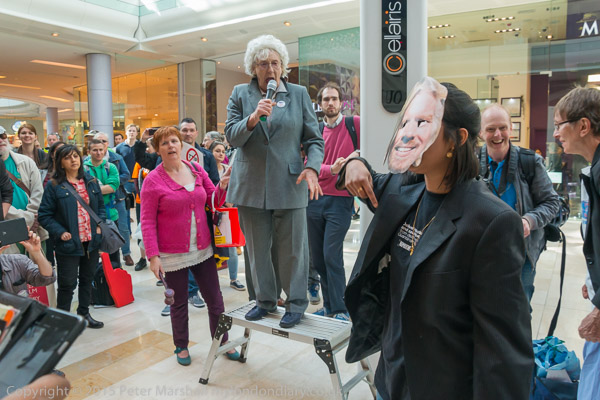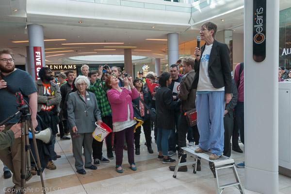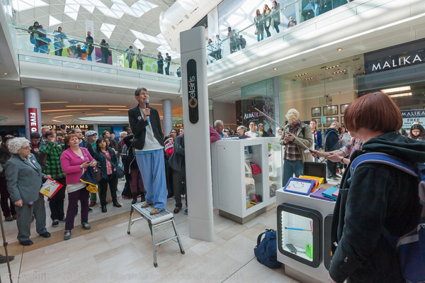 Gay Lee introduces the protest and the short piece of street theatre in the Westfield centre