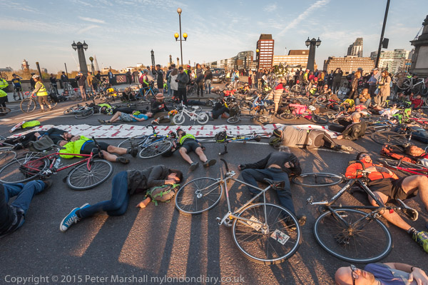 The die-in stretched all around the roundabout where the bridge meets Millbank and Horseferry Rd