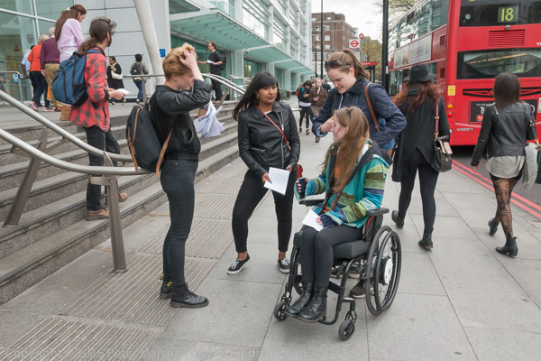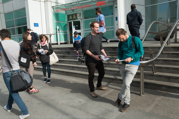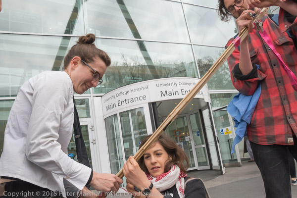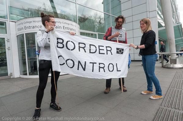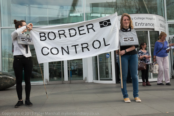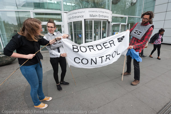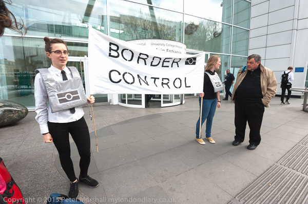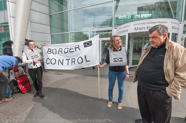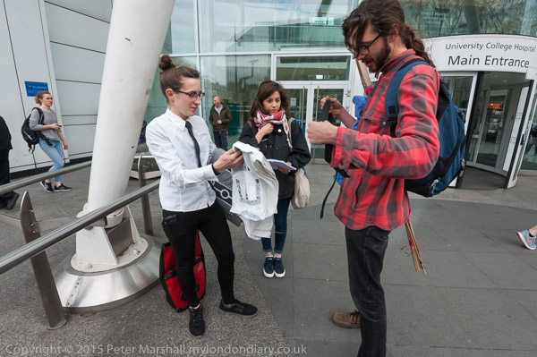 Docs Not Cops protesters talk to people outside University College Hospital and hand out flyers as they wait
