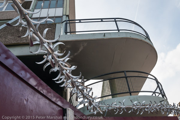 Fences and an anticlimb barrier around empty flats which are to be demolished