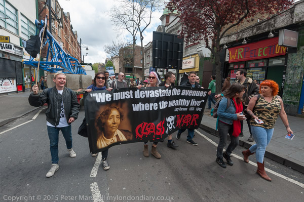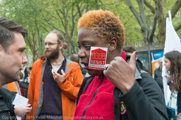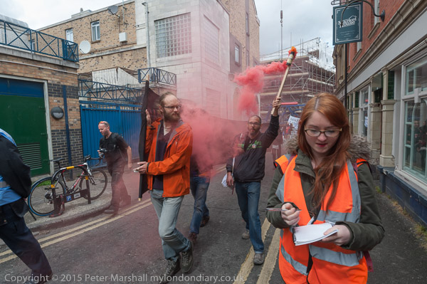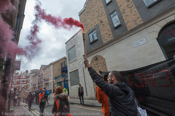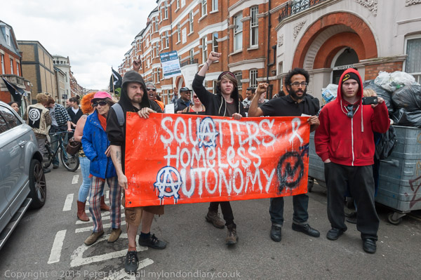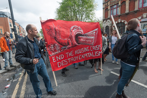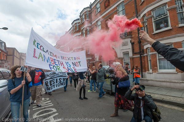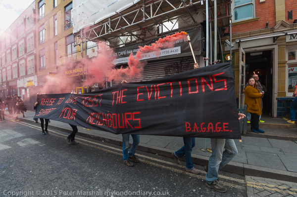 B.A.G.A.G.E (Brixton Action Group Against Gentrification and Evictions) banner and a red flare
