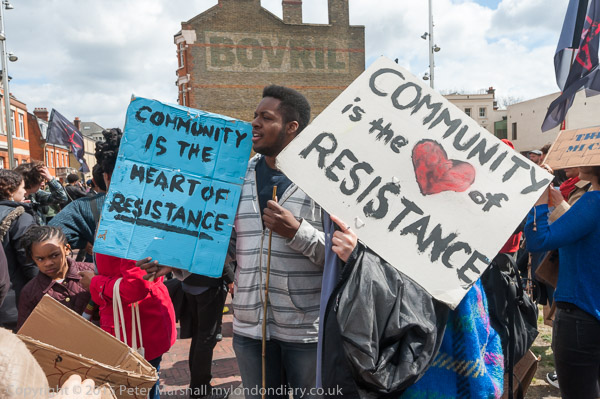 'The People United will never be defeated - marchers from the Guiness Estate arrive at Reclaim Brixton