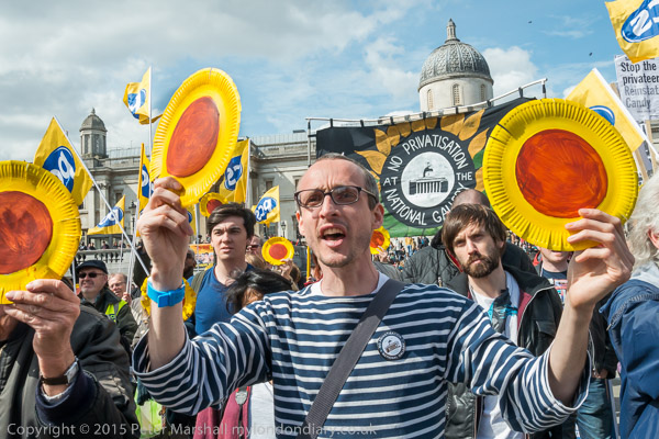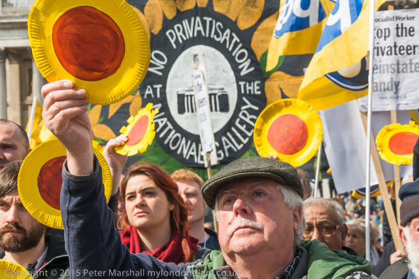 A striking National Gallery worker holds up two 'sunflowers' in front of their 'No Privatisation' banner and the dome of the National Gallery