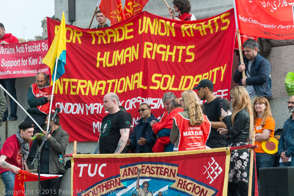 The main banner 'For Trade Unions Rights, Human Rights and International Solidarity' on the plinth