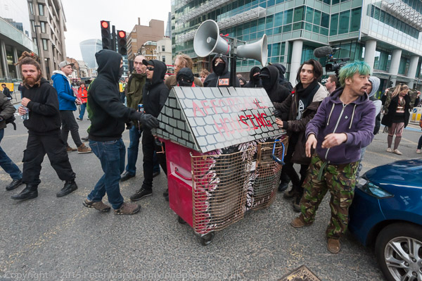 and the protesers moved onto the road, with one person lying down and another holding a poster 'Evict the Rich from this City'