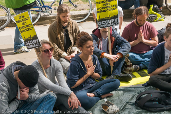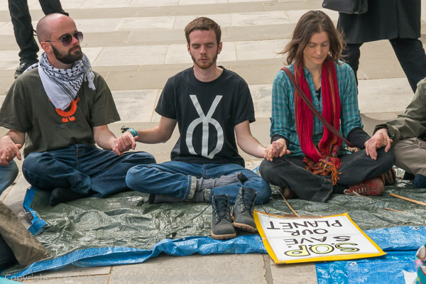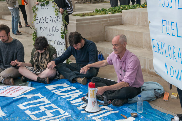 People join hands in meditation around the circle led by Donnachadh McCarthy