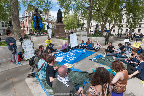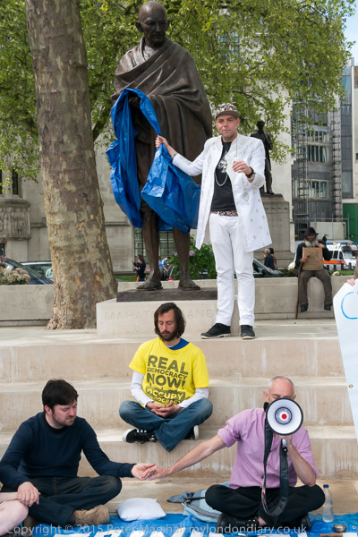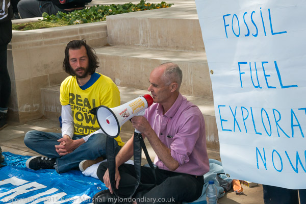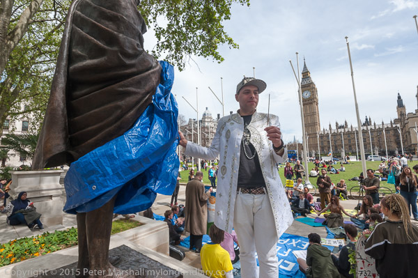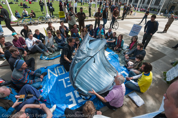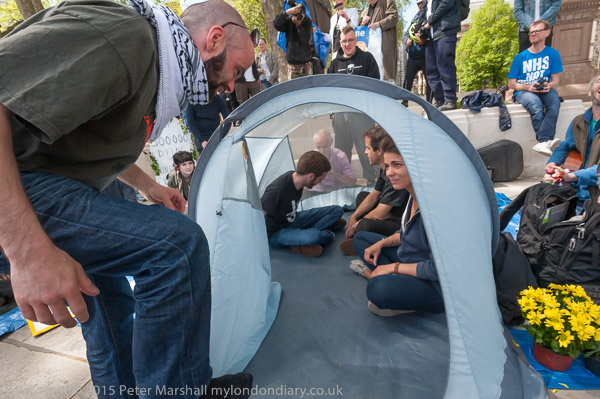 Donnachadh McCarthy puts a tent in the middle of the blue tarpaulin in front of him