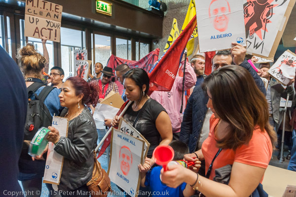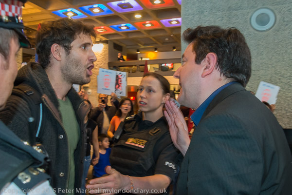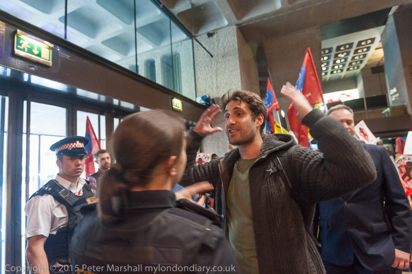 UVW General Secretary Petros Elia talks with police and a Barbican manager