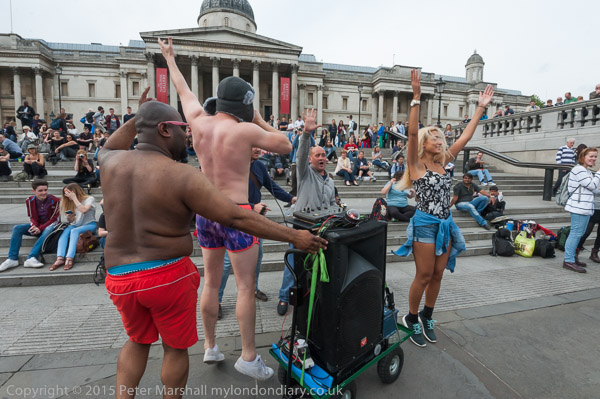 Loud disco music came to Trafalgar Square - and one man jumped into the fountain to dance to it