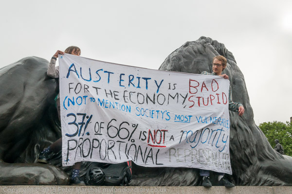A banner in front of one of the lions pointing out the Tory government gained only 37% of a 66% of the vote