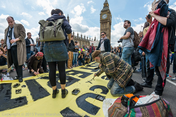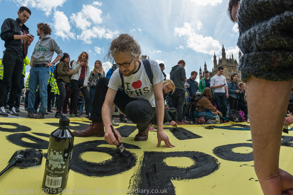 The painting continues and the slogan is '£12 bn more cuts £120 bn tax dodged - AUSTERITY IS A LIE'