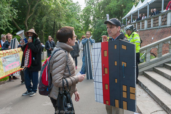 An opera goer talks with one of the protesters. Some were sympathetic to the protest