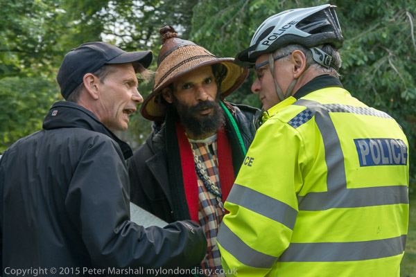 A police officer talks with the protest organisers - they assure him they will end the protest at 7pm so as not to interfere with the opera