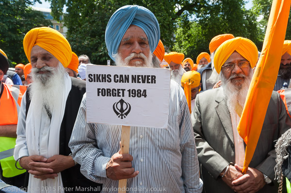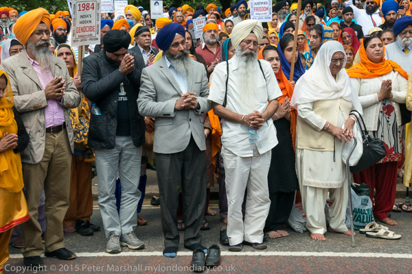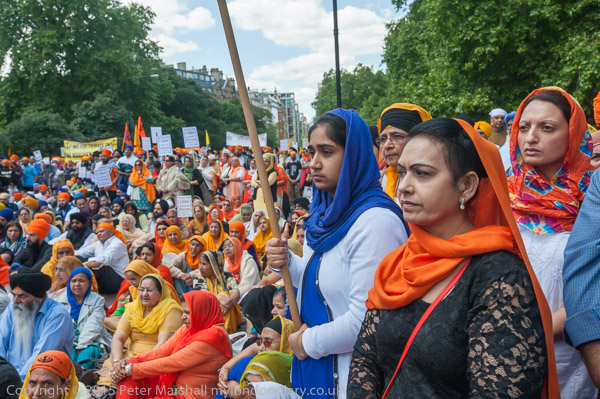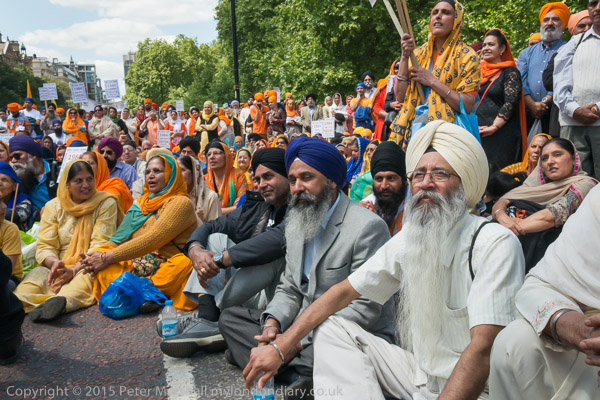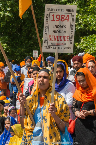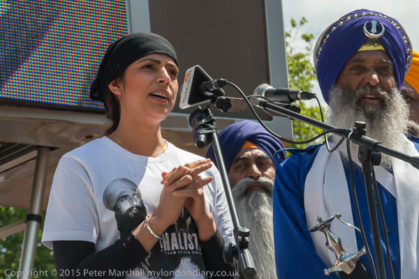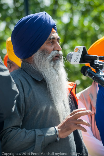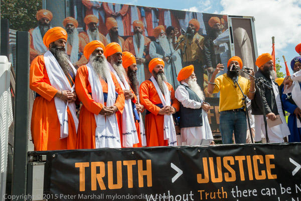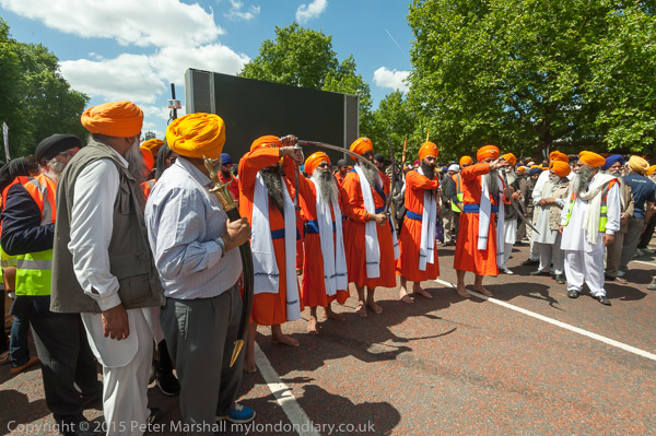 Khalsa representing the Five Blessed Ones draw their ceremonial swords at the start of the Sikh Freedom march