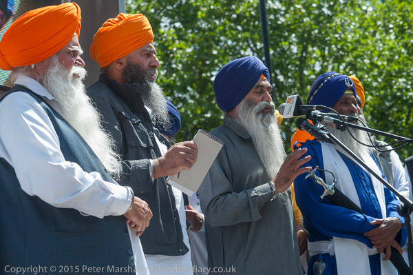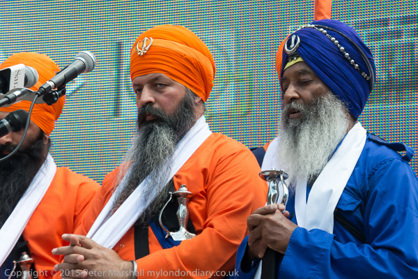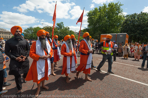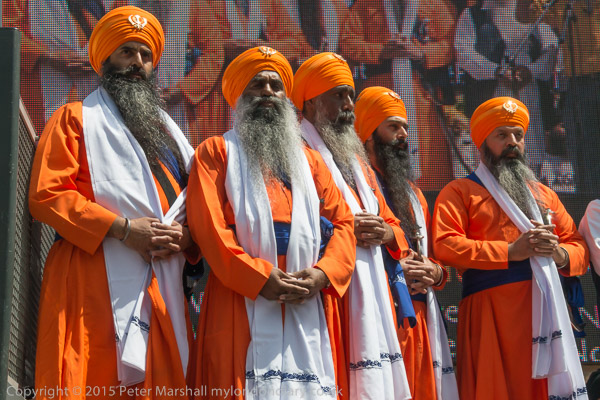 Five Khalsa representing the Blessed Ones along with two bearing the Sikh standard walk barefoot up towards the stage