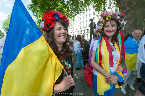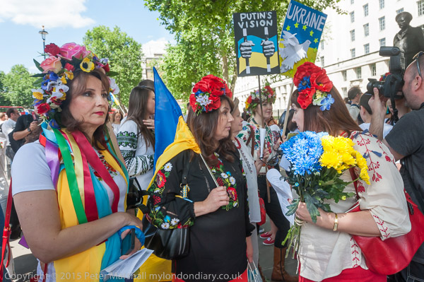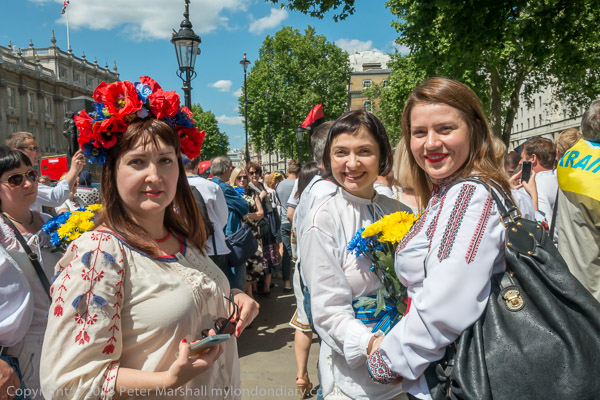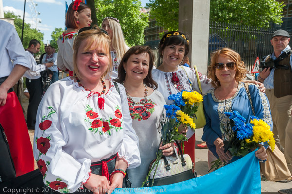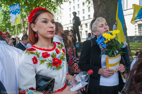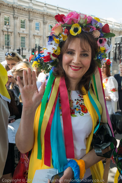 Women wear traditional Ukrainian Vyshyvanka embroidered shirts. Some carried flowers in the blue and yellow of the Ukrainian flag.