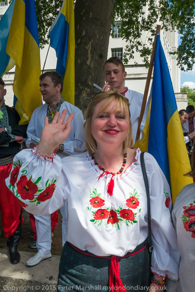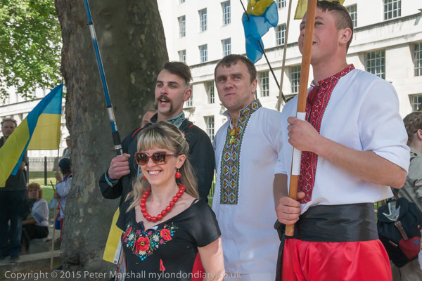 Some men had shirts with embroidered trim and wore traditional clothes, holding poles flying the Ukrainian flag