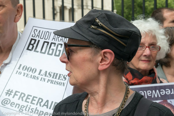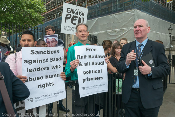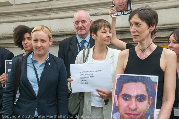 Peter Tatchell and Natalie McGarry MP outside Downing St with letter to David Cameron and picture of jailed blogger Raif Badawi.