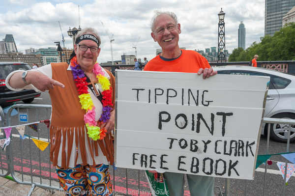 Toby Clark and a friend offering a free eboo, 'Tipping Point'