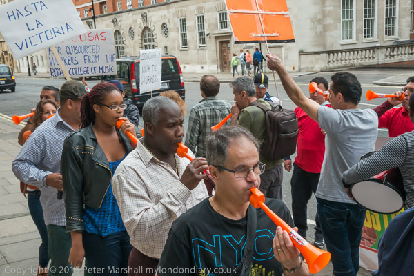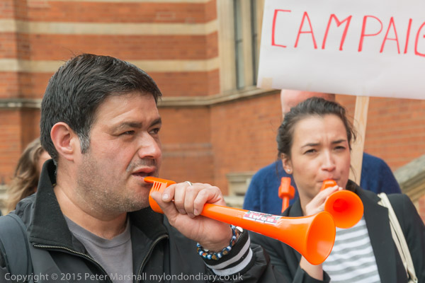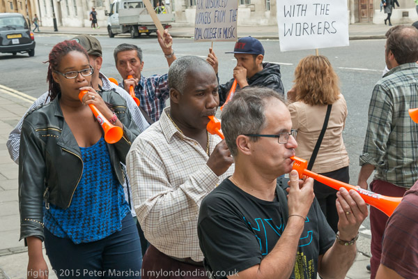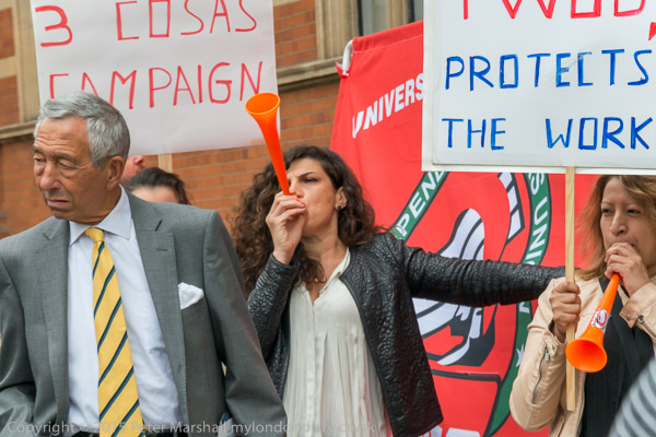 The protesters start to walk in a circle in front of the main entrance as they make a real din