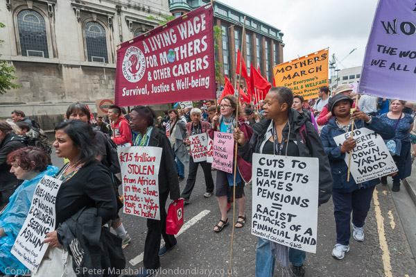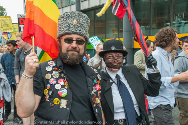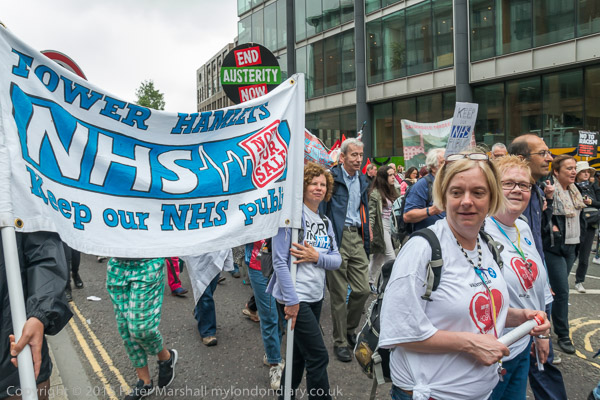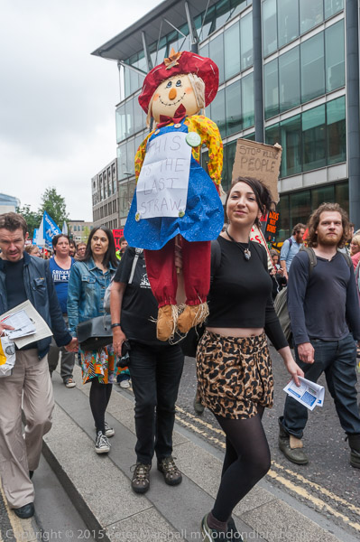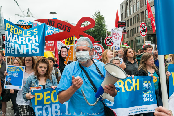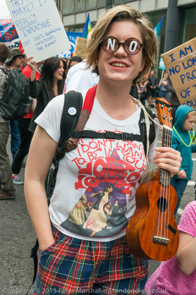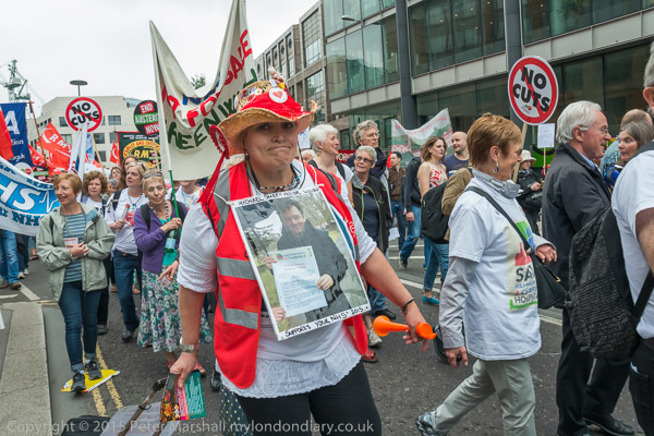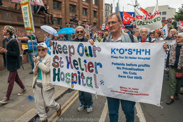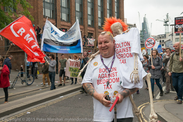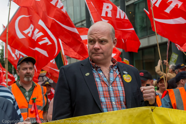 RMT - John Reid, London Transport member on the RMT Council of Executives in 'Cuts KILL' t-shirt - Passengers Before Profit banner-