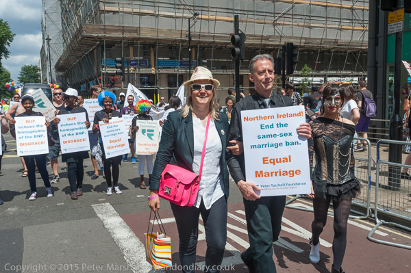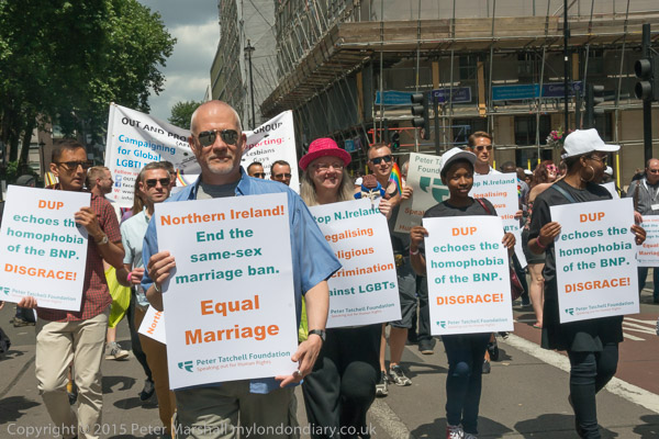 Peter tatchell with a poster calling for an end to the ban on mixed-sex marriage in Northern Ireland
