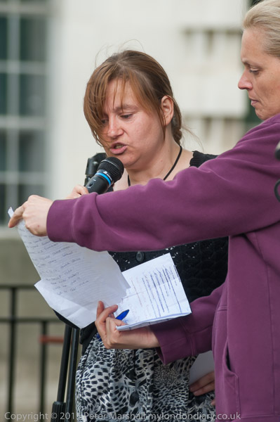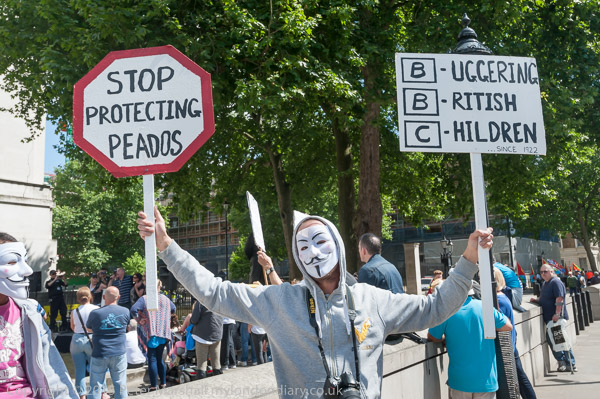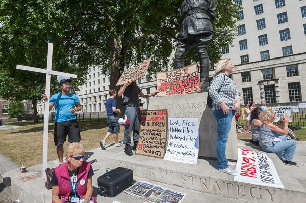 A man speaks at a rally at Downing St calling for an end to the government and police covering up of child abuse.