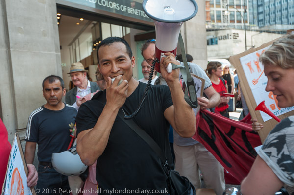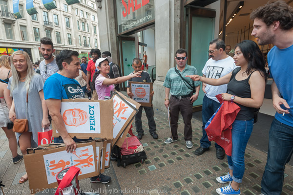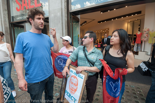 Percy who is being targeted unfairly by Sotheby's because of his trade union activities there holds a placard 'We Are All Percy'